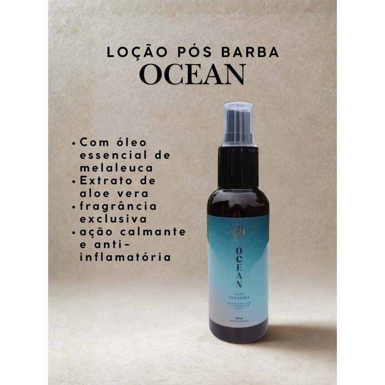 Descrição: A loção pós barba Ocean ajuda a recuperar e enganar a pele do rosto após o desgaste do barbear. Possui em sua formulação o óleo essencial de melaleuca, ativo natural conhecido por suas propriedades antissépticas e anti-inflamatórias. Contém extrato de aloe vera que promove hidratação e restauração da pele. Além disso, suas fragrâncias suaves e exclusivas com óleos essenciais finalizam com refrescância e bem estar este momento único do barbear.