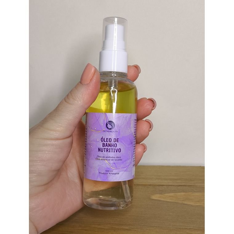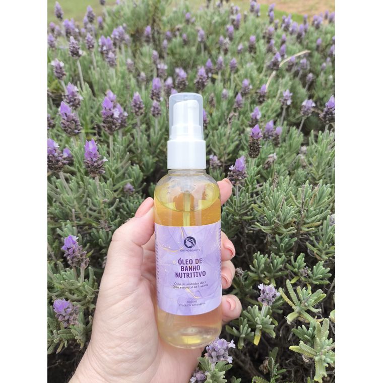 Óleo de Banho Nutritivo com Óleo Essencial de Lavanda - 100ml. Produto 100% Natural. Sem parabenos, sem petrolatos, sem fragrância sintética, sem corantes, sem testes em animais e vegano.